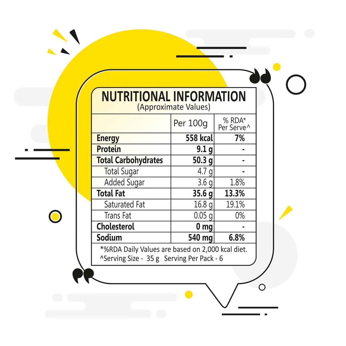 Aloo Bhujiya: Refined Vegetable Oil (Palmolein Oil/Soybean Oil/Cotton Seed Oil), Potato Flakes (33%), Gram Pulse Flour, Tepary Beans Flour, Rice Flour, Corn Flour, Starch, lodised Salt, Spices & Condiments (Coriander Powder, Cumin Powder, Mango Powder, Garlic Powder, Onion Powder, Lemon Powder, Ginger Powder, Red Chilli Powder, Big Cardamom Powder, Mace Powder, Mint Leaves (0.4% ), Nutmeg Powder, Turmeric Powder), Sugar Powder, Maltodextrin, Acidity Regulator (INS 330, INS 296) & Anticaking Agent (INS 551).
