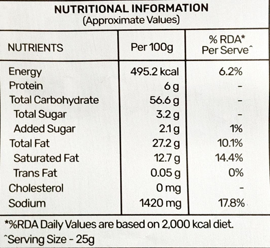 Chips: Potato, Edible Vegetable Oil (Palmolein Oil / Soybean Oil / Cotton Seed Oil), Sugar Powder, Spices & Condiments- (Onion Powder (1.6%), Spring Onion, Parsley Leaves, Green Chilli Powder), Milk Solids (1.4%), lodized Salt, Acidity Regulator (INS 330), Maltodextrin, Anticaking Agent (INS 551) & Flavour Enhancers