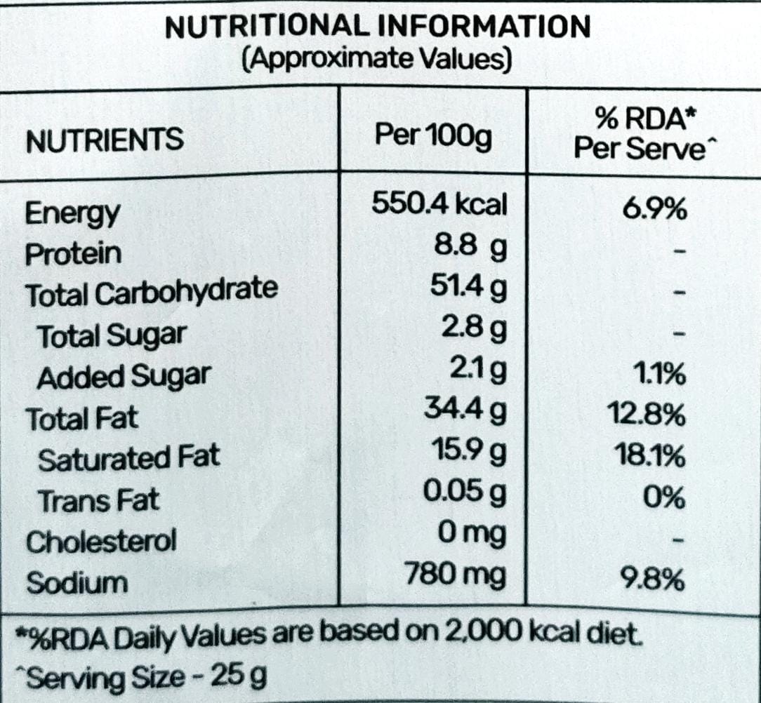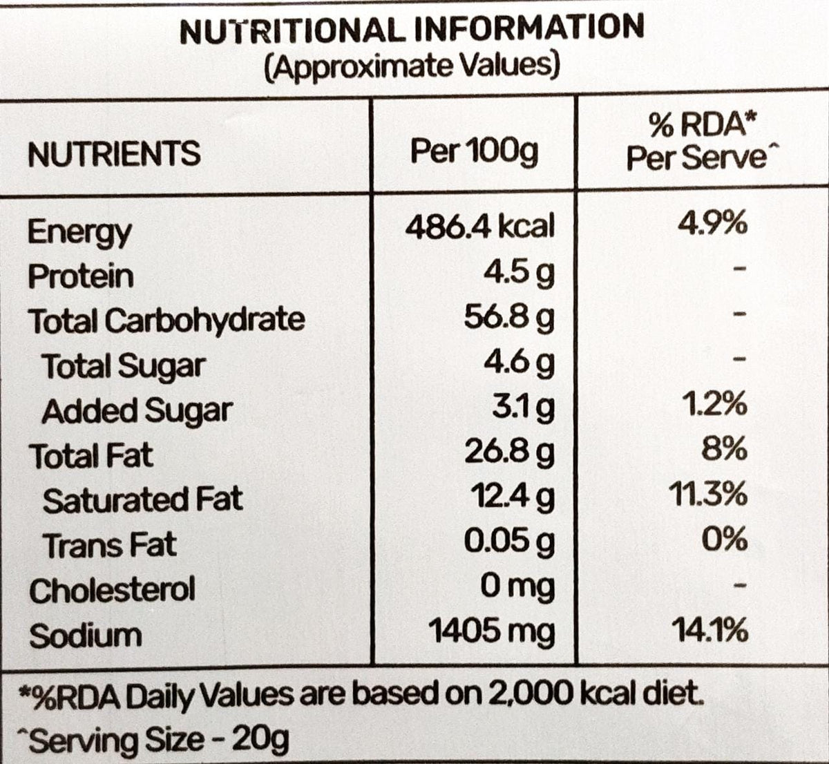 Moon Cups: Refined Wheat Flour (Maida), Edible Vegetable Oil (Palmolein Oil/Soybean Oil/Cotton Seed Oil), Maize Starch, lodised Salt, Leavening Agent (INS 500(ii)}, Spices & Condiments- (Dry Mango Powder, Onion Powder, Garlic Powder, Red Chilli Powder, Turmeric Powder, Cumin Powder, Clove Powder, Black Pepper Powder, Big Carda- mom Powder, Bay Leaves, Fenugreek Powder), Tomato Powder, Hydrolysed Vegetable Protein (Soya), Acidity Regulator (INS 330, INS 296), Natural Color (INS 100(ii)}, Modified Starch (INS 1450), Anti-Caking Agent (INS 551), & Flavour Enhancers (INS 627, INS 631).