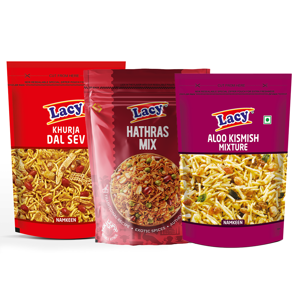 Hathras Mix: A mouthwatering HATHRAS MIX of spicy treats and chatpata namkeen. LACY HATHRAS MIX is made with crunchy peanuts, roasted peas, and sev. This scrumptious snack is the ultimate accompaniment with drinks at teatime.