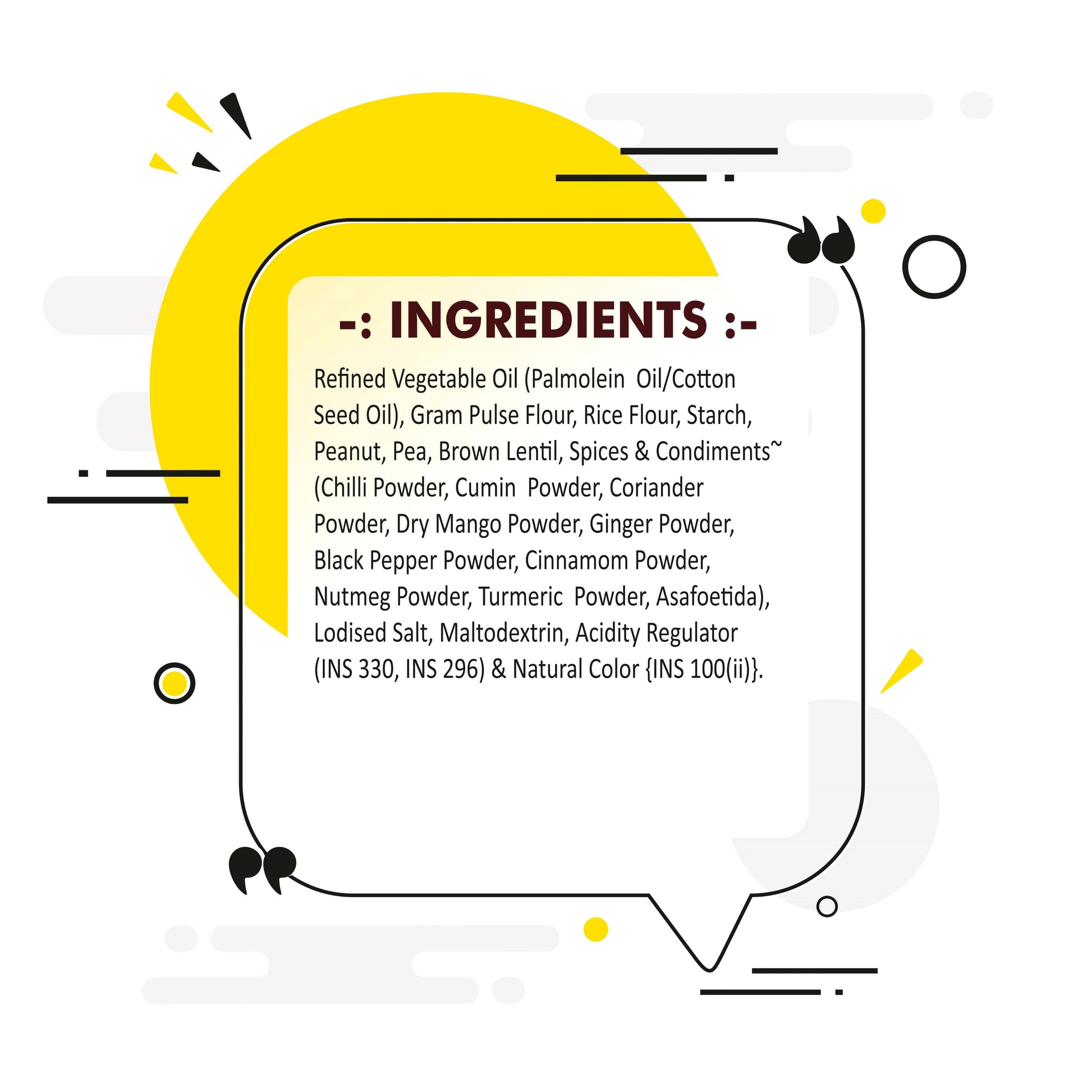 Refined Vegetable Oil (Palmolein Oil/Cotton Seed Oil), Gram Pulse Flour, Rice Flour, Starch, Peanut, Pea, Brown Lentil, Spices & Condiments~ (Chilli Powder, Cumin Powder, Coriander Powder, Dry Mango Powder, Ginger Powder, Black Pepper Powder, Cinnamom Powder, Nutmeg Powder, Turmeric Powder, Asafoetida), Lodised Salt, Maltodextrin, Acidity Regulator (INS 330, INS 296) & Natural Color {INS 100(ii)}.