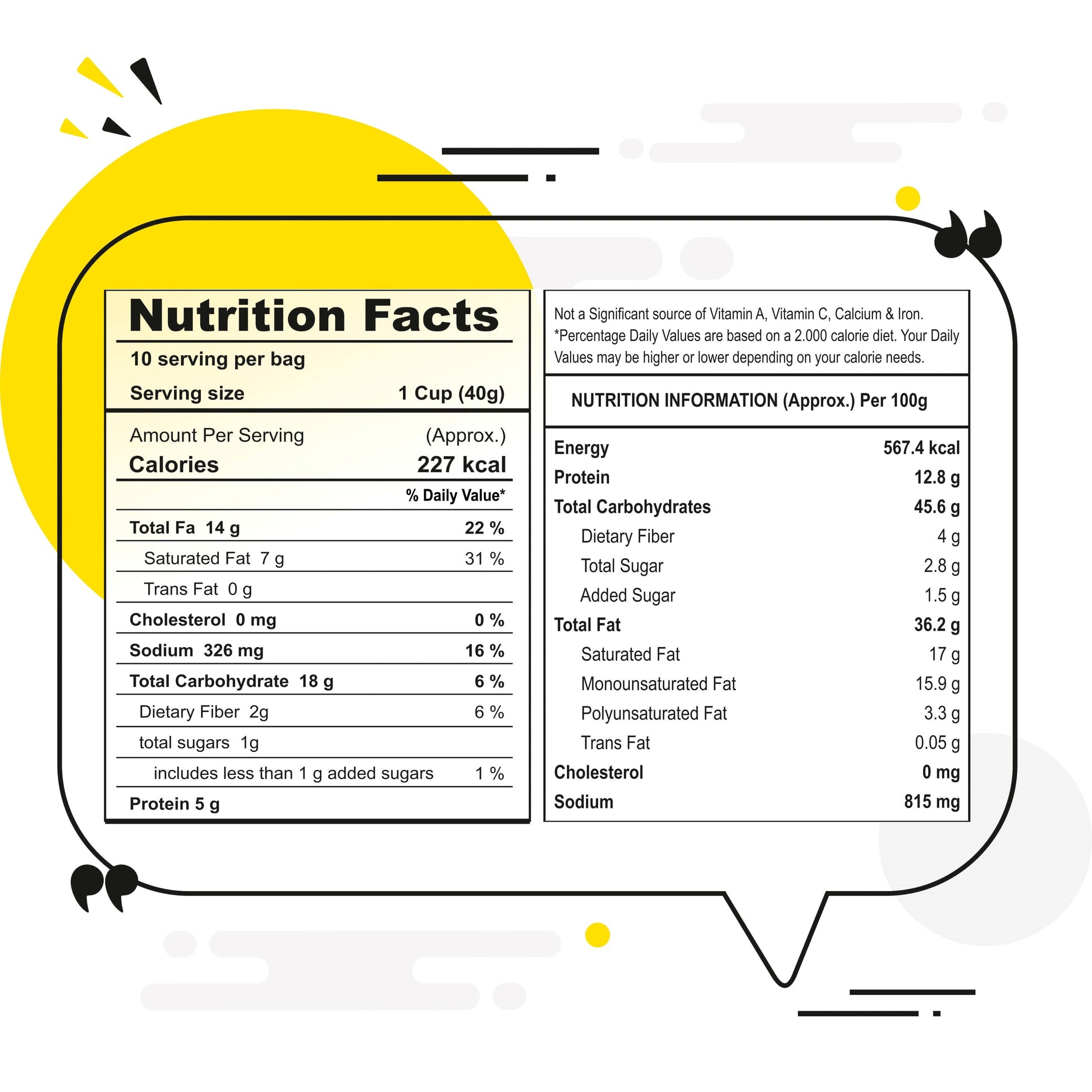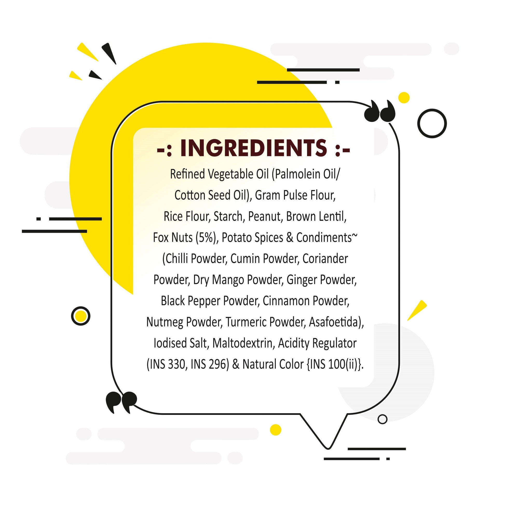 Refined Vegetable Oil (Palmolein Oil/Cotton Seed Oil), Gram Pulse Flour, Rice Flour, Starch, Peanut, Brown Lentil, Fox Nuts (5%), Potato Spices & Condiments~ (Chilli Powder, Cumin Powder, Coriander Powder, Dry Mango Powder, Ginger Powder, Black Pepper Powder, Cinnamon Powder, Nutmeg Powder, Turmeric Powder, Asafoetida), lodised Salt, Maltodextrin, Acidity Regulator (INS 330, INS 296) & Natural Color {INS 100(ii)}.