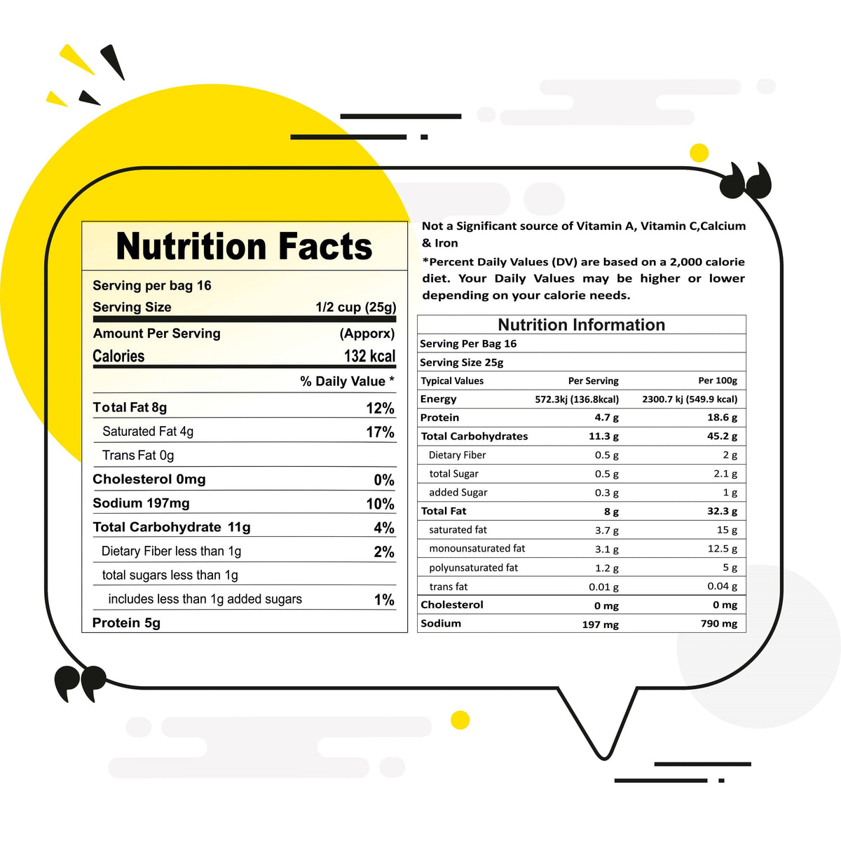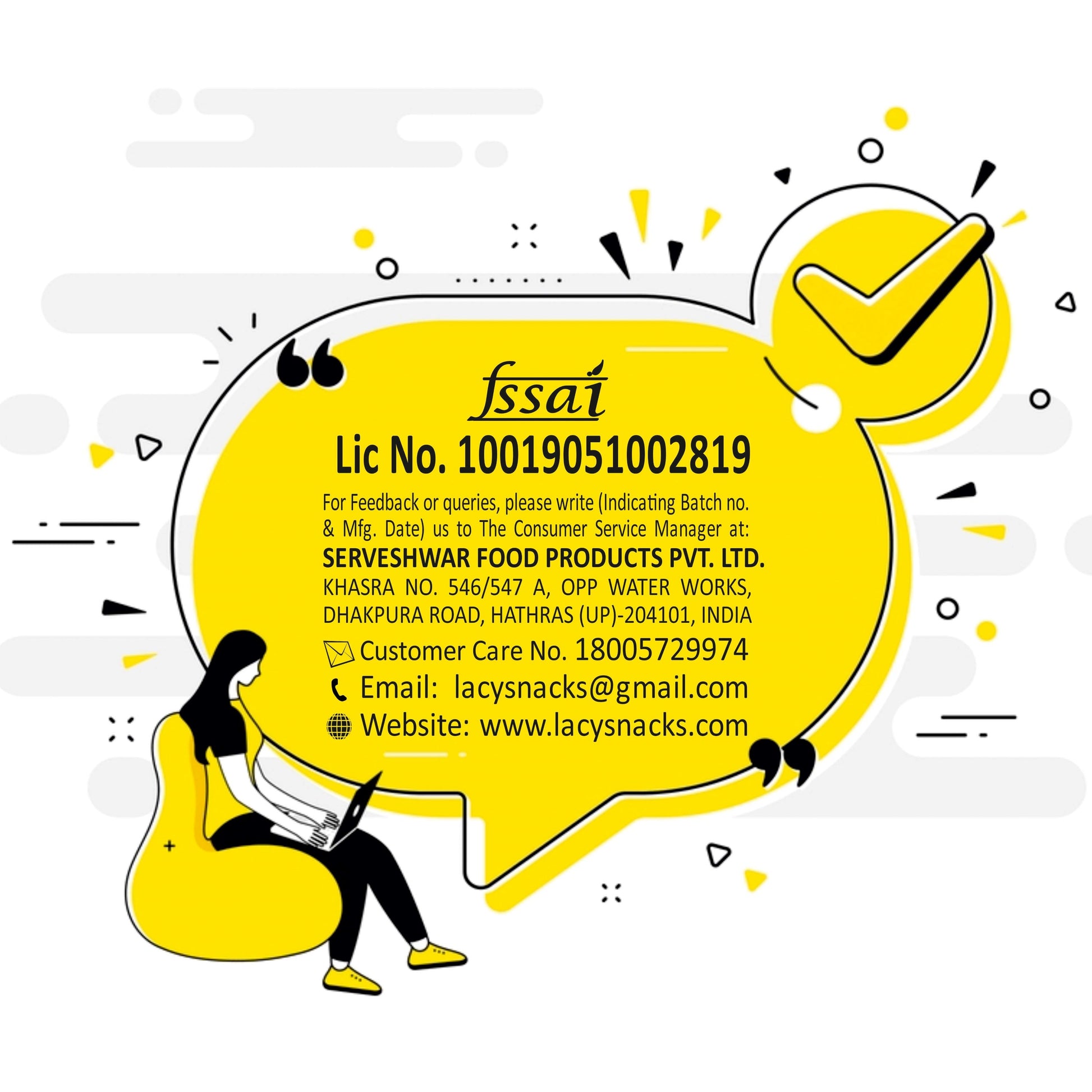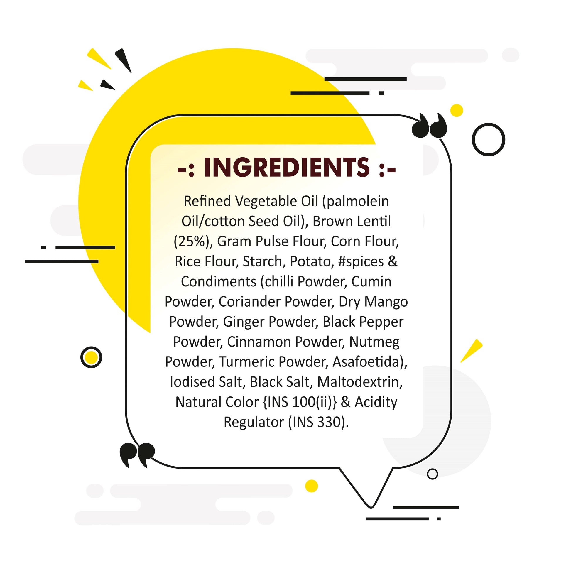 Refined Vegetable Oil (Palmolein Oil/ Soybean Oil/Cotton Seed Oil), Gram Pulse Flour, Rice Flour, Starch, Brown Lentil (7%), Chickpea, Peanut, Potato, Pea, Spices & Condiments~ (Chilli Powder, Cumin Powder, Coriander Powder, Bishop's Weed, Dry Mango Powder, Ginger Powder, Cinnamom Powder, Nutmeg Powder, Turmeric Powder, Asafoetida), lodised Salt, Acidity Regulator (INS 330, INS 296), Natural Color {INS 100(ii)}, Raising Agent {INS 550 (ii)} & Anti-Caking Agent (INS 551)