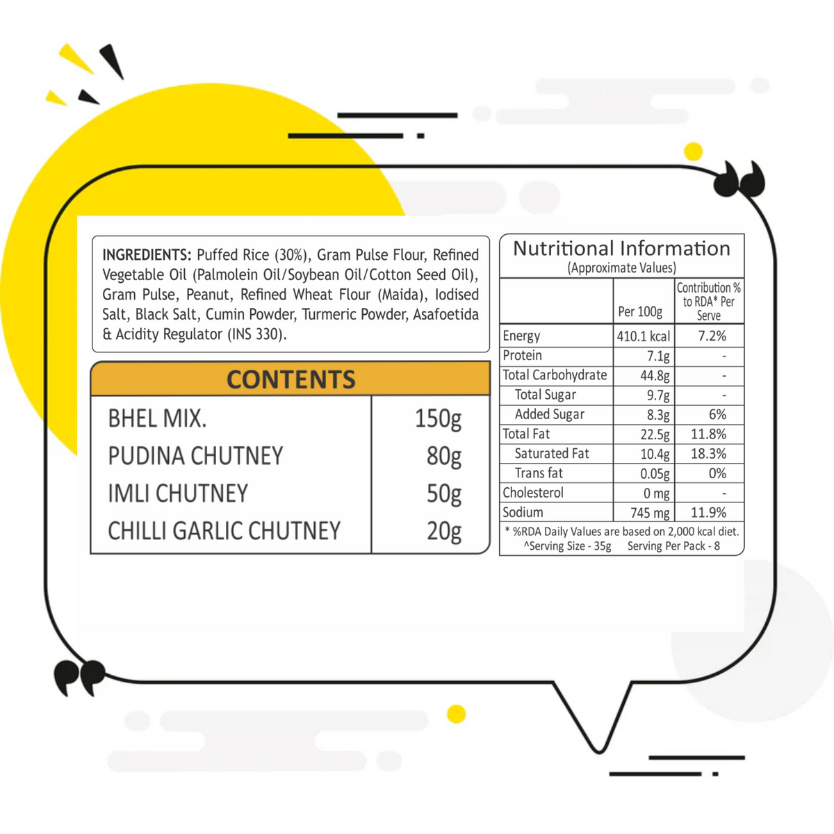 Bhelpuri: Puffed Rice (30%), Gram Pulse Flour, Refined Vegetable Oil (Palmolein Oil/Soybean Oil/Cotton Seed Oil), Gram Pulse, Peanut, Refined Wheat Flour (Maida), lodised Salt, Black Salt, Cumin Powder, Turmeric Powder, Asafoetida & Acidity Regulator (INS 330).